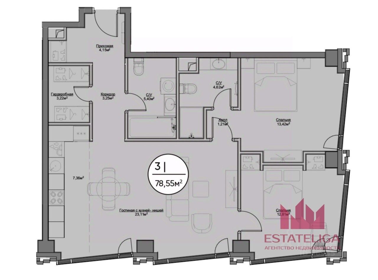 Планировочное решение: просторная кухня-гостиная, две спальни, два с/у.