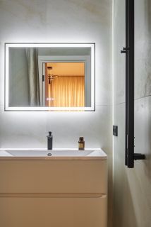 Ремонт выполнен с использованием современных надежных и практичных материалов, водоснабжение сшитый полиэтилен Rehau, отделочные материалы: пол-кварцвинил, стены комнат защищены антивандальными моющимися обоями с покраской в 3 слоя, санузлы облицованы широкоформатным керамогранитом, потолки натяжные с теневым профилем и встроенными светильниками.