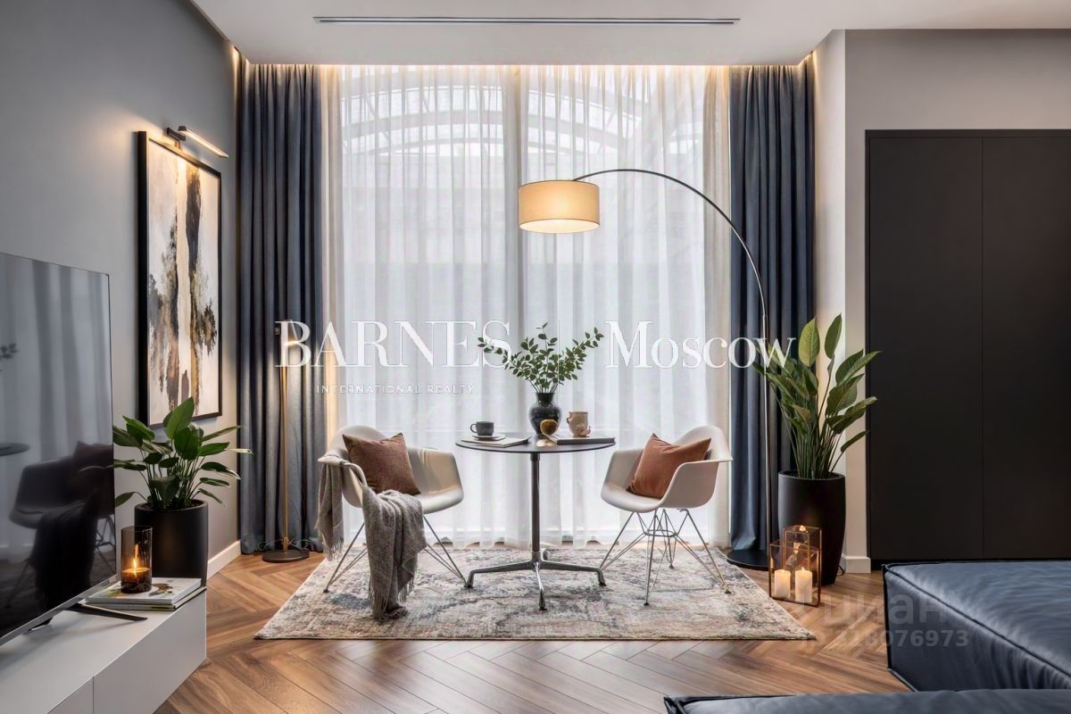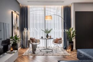 Панорамные окна ориентированы в сторону внутреннего декоративного атриума, накрытого стеклянным куполом. Высокий предпоследний этаж и прозрачный купол обеспечивают прекрасную инсоляцию апартамента. В апартаменте можно почувствовать себя максимально защищенным от внешних шумов большого города. При этом в пешей доступности все самые интересные места центра Москвы: Патриаршие пруды, Триумфальная площадь, Московский зоопарк, Театр Сатиры, Музей-театр "Булгаковский дом", Музей современного искусства на Зоологической.