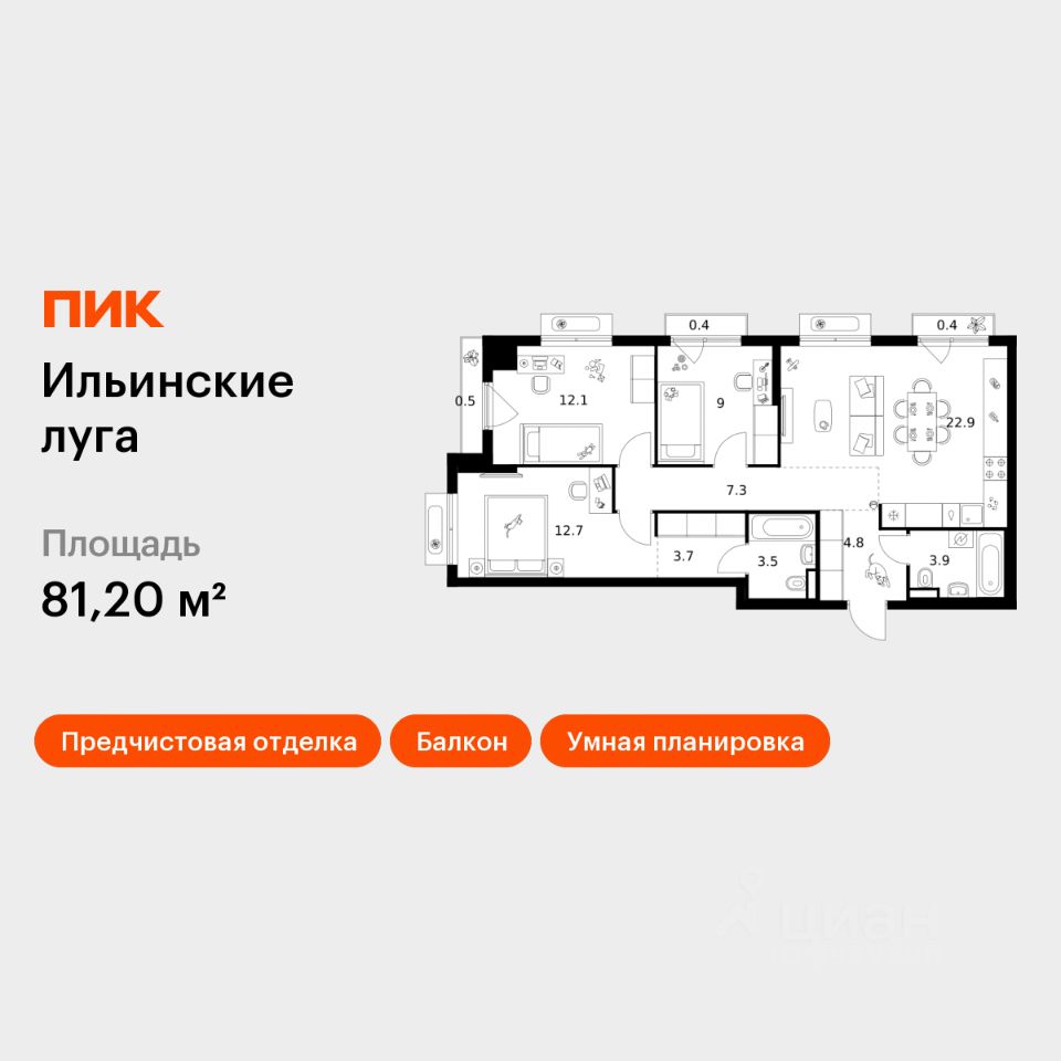 Продаётся 3-комн. квартира площадью 81,2 кв.м на 5 этаже 9 этажного дома (Корпус 4.3, Секция 5) проекта ПИК Ильинские луга. Светлый просторный подъезд на уровне земли, функциональная планировка, большие окна, предчистовая отделка.