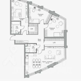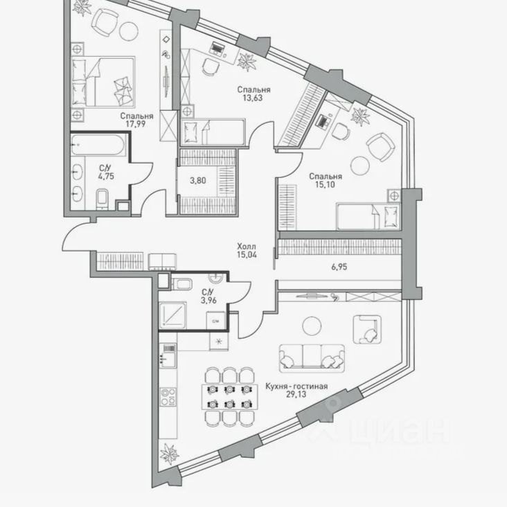 О квартире: 3 изолированные комнаты, просторная кухня-гостинная, 2 совмещенных с/у, гардеробные. Без отделки.
