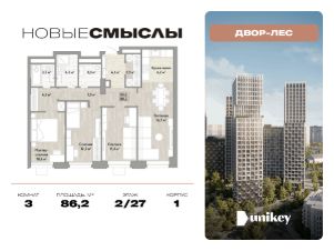 В жилом комплексе, расположенном по соседству с ландшафтным парком "Южное Бутово", продается 3-комнатная квартира площадью 86.20 кв. м. без отделки. Квартира расположена на 2 этаже 1 корпуса в жилом квартале комфорт-класса "Новые Смыслы" (ГК Unikey/Юникей).