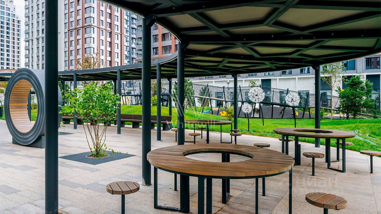 Главное о доме. "Остров" — квартал бизнес-класса от "Донстроя" на 40 гектарах Мнёвниковской поймы. Здесь 39 корпусов переменной этажности, часть выходит на первую линию Москвы-реки. Панорамные окна открывают виды на Гребной канал и зелёные холмы Крылатского. Концепция all inclusive превращает комплекс в город внутри города: Центральный парк, набережные, кафе и рестораны, торговый центр, детские сады и школы. Дворы оформлены тематически: луговой, водный, ландшафтный с ручьём или с амфитеатром. В каждом — спортивные и детские площадки, тихие лаунж-зоны, 5G и зарядки для гаджетов.