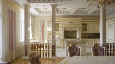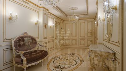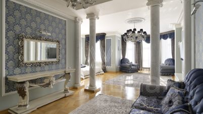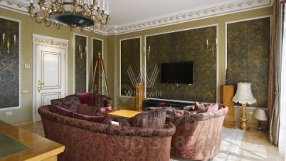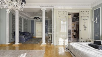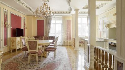 Просторная квартира в комплексе премиум-класса "Онегин" на шестом этаже. Премиальная дизайнерская отделка в стиле дворцовой классики, интерьер украшен изящной лепниной, колоннами. Высокие потолки с кессонами, панорамные окна, большое количество света.