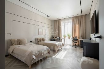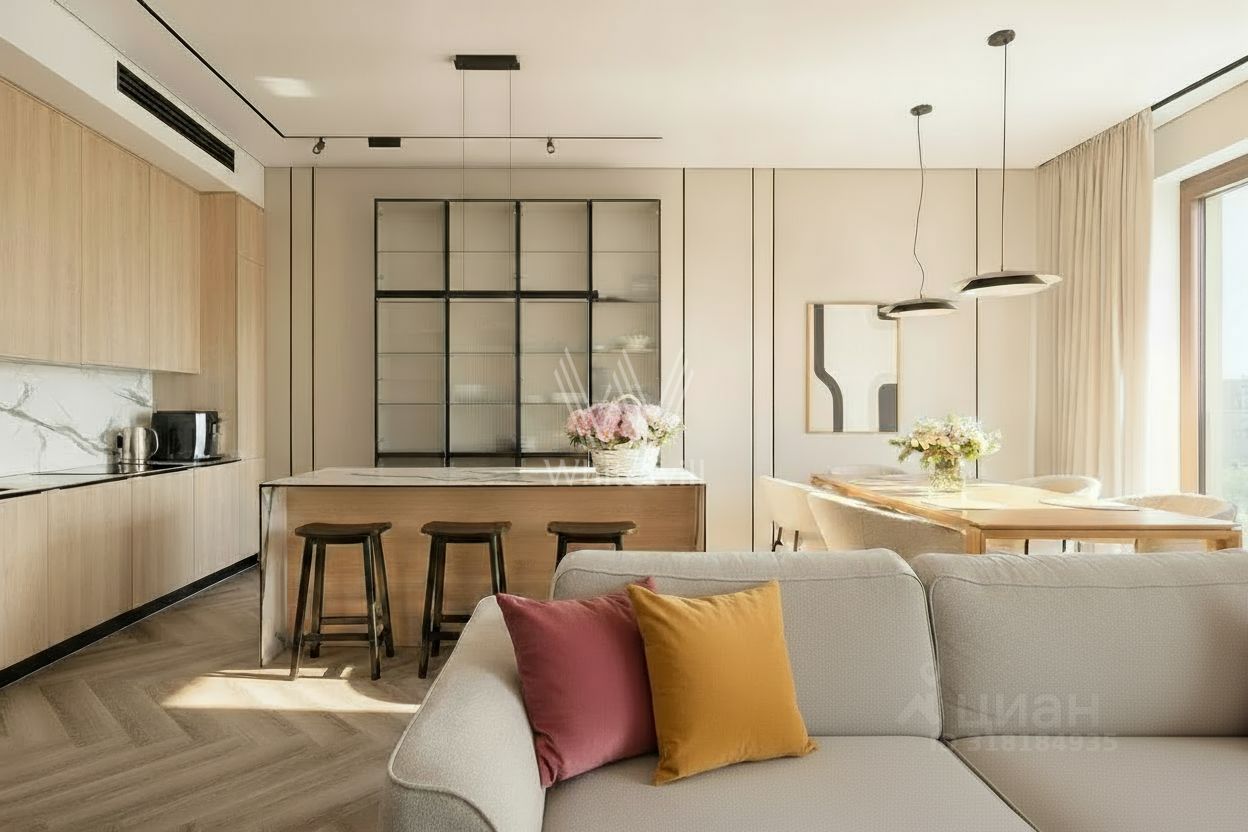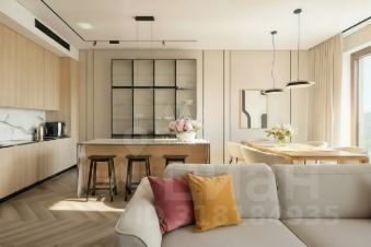 Квартира с отделкой расположена на седьмом этаже. Функциональная планировка включает кухню-гостиную с обеденной зоной, две спальни со своими гардеробными, два санузла, постирочную комнату, балкон и холл. Благодаря панорамному остеклению пространство наполнено естественным светом и теплом, открываются виды на благоустроенную территорию комплекса и тихий переулок. Наличие в комплексе подземного паркинга.