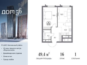 В премиум-квартале "Дом 56" на Бауманской напрямую от девелопера ГК "Галс-Девелопмент" представлена 1-комнатная квартира на 16 этаже общей площадью 49.40 м².