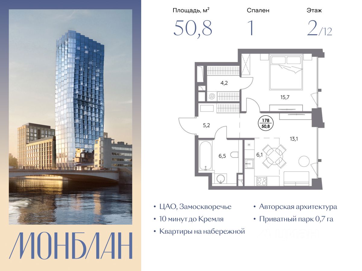 В элитном жилом комплексе "Монблан" на Шлюзовой набережной в Замоскворечье напрямую от девелопера ГК "Галс-Девелопмент" представлена 1-комнатная квартира квартира на 2 этаже общей площадью 50.80 м².