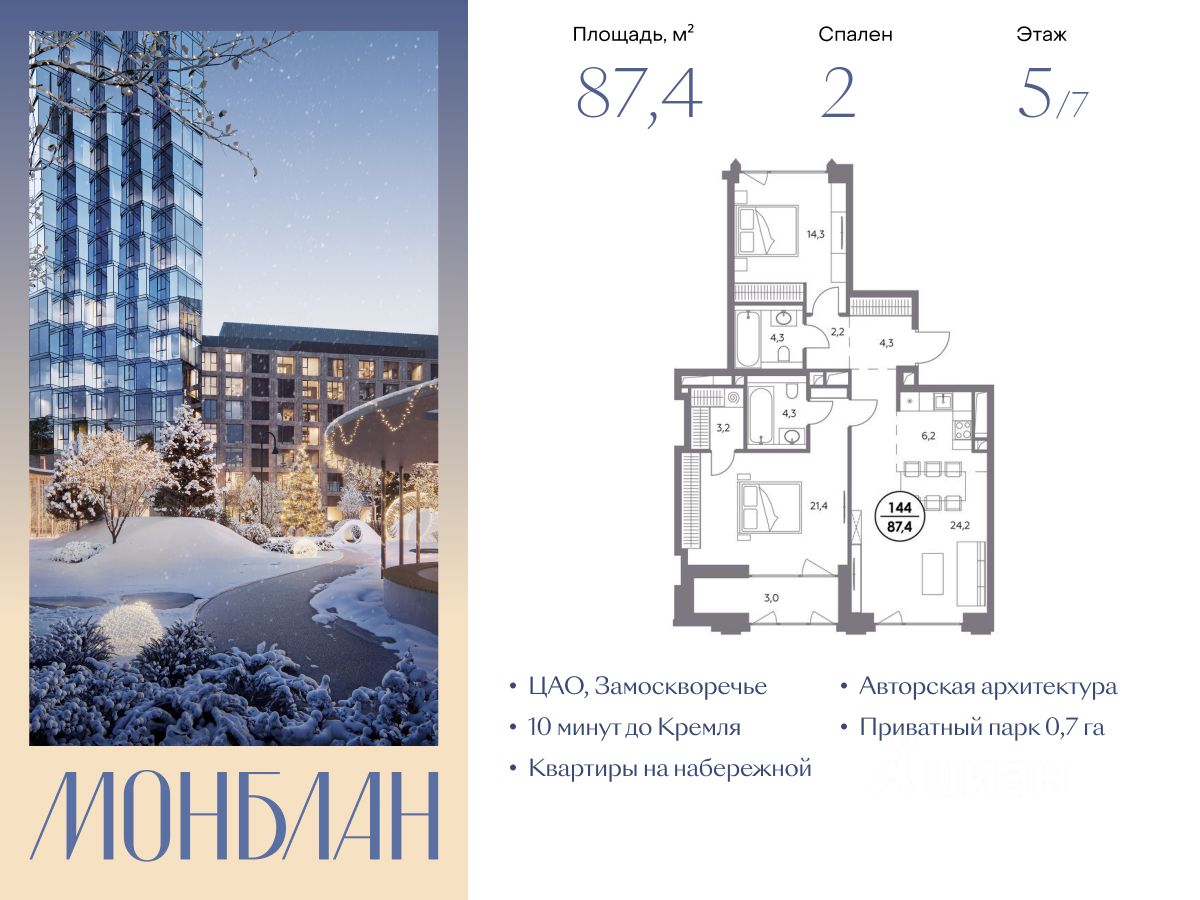 В элитном жилом комплексе "Монблан" на Шлюзовой набережной в Замоскворечье напрямую от девелопера ГК "Галс-Девелопмент" представлена 2-комнатная квартира квартира на 5 этаже общей площадью 87.40 м².