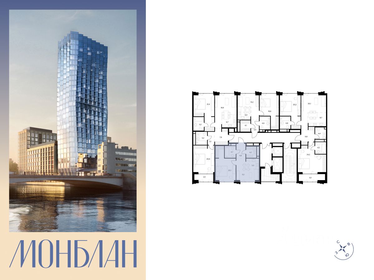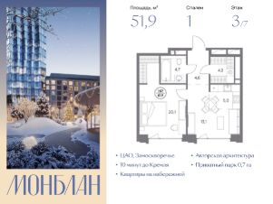В элитном жилом комплексе "Монблан" на Шлюзовой набережной в Замоскворечье напрямую от девелопера ГК "Галс-Девелопмент" представлена 1-комнатная квартира квартира на 3 этаже общей площадью 51.90 м².