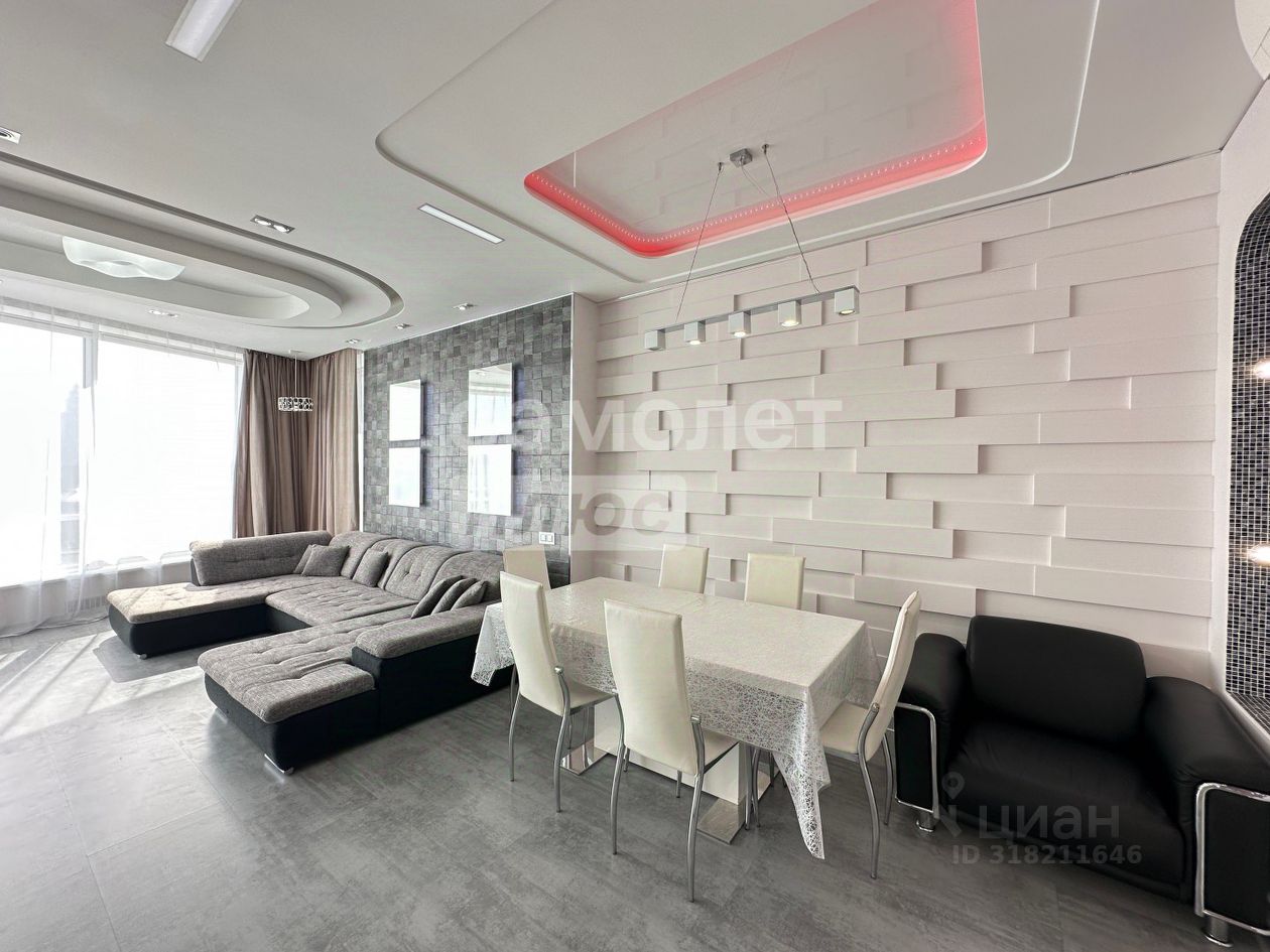 В квартире выполнен дизайнерский ремонт с использованием дорогих материалов: натуральное дерево, итальянская плитка, декоративные панели, современное освещение.
