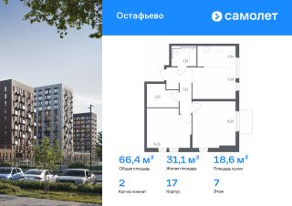 Предлагается 2-комнатная квартира комфорт-класса 66,41 кв.м в корпусе 17 на 7 этаже, в ЖК "Остафьево"