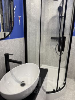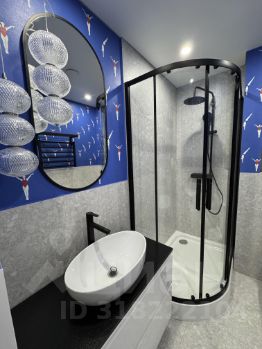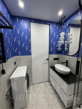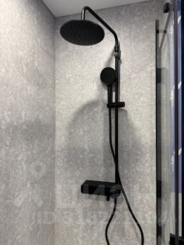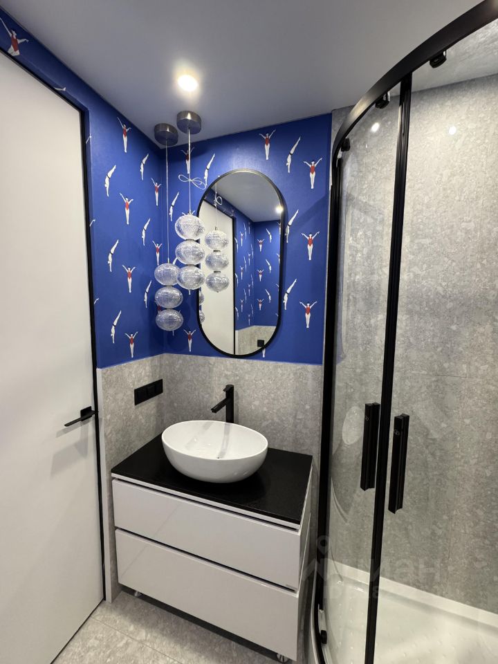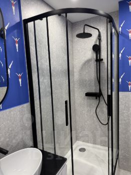 Большая итальянская душевая кабина 120*80 см, итальянский унитаз, дизайнерские обои от бренда Papierpeint, немецкая душевая лейка AM.PM, стиральная машина Indesit и полотенцесушитель.