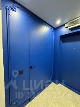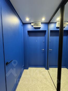 Установлена высокая (230см) межкомнатная дверь скрытого монтажа с молдингами, с обратной стороны зеркальный шкаф-купе с большой зоной хранения.