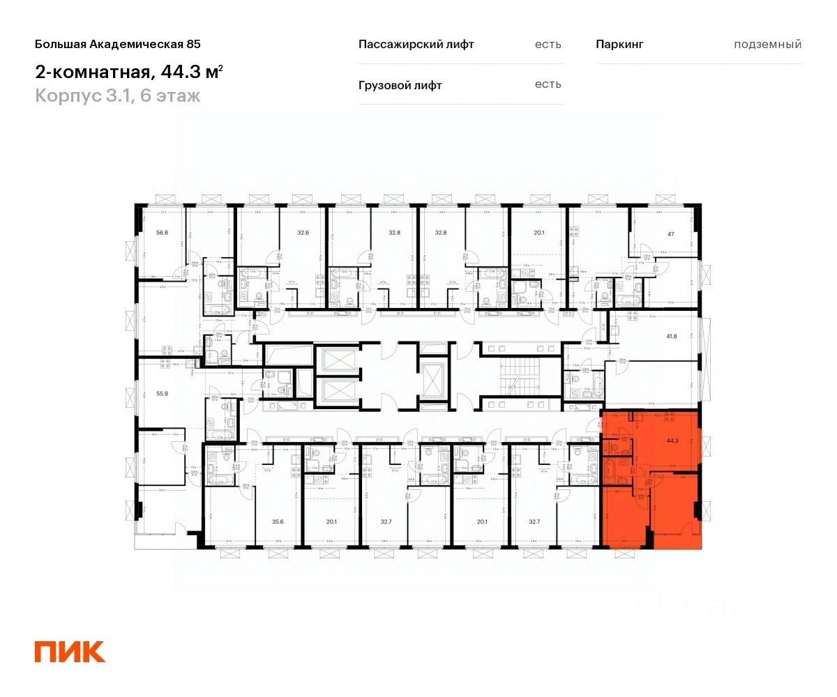 Продаётся 2-комн. квартира площадью 44,3 кв.м на 6 этаже 19 этажного дома (Корпус 3.1, Секция 1) проекта ПИК Большая Академическая 85. Светлый просторный подъезд на уровне земли, функциональная планировка, большие окна, c отделкой.