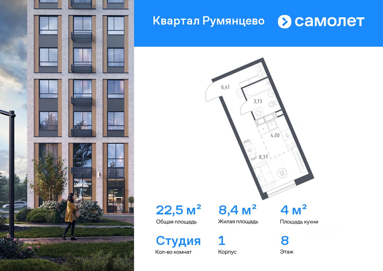 Предлагается квартира студия комфорт-класса 22,51 кв.м в корпусе 1 на 8 этаже, в ЖК "Квартал Румянцево"