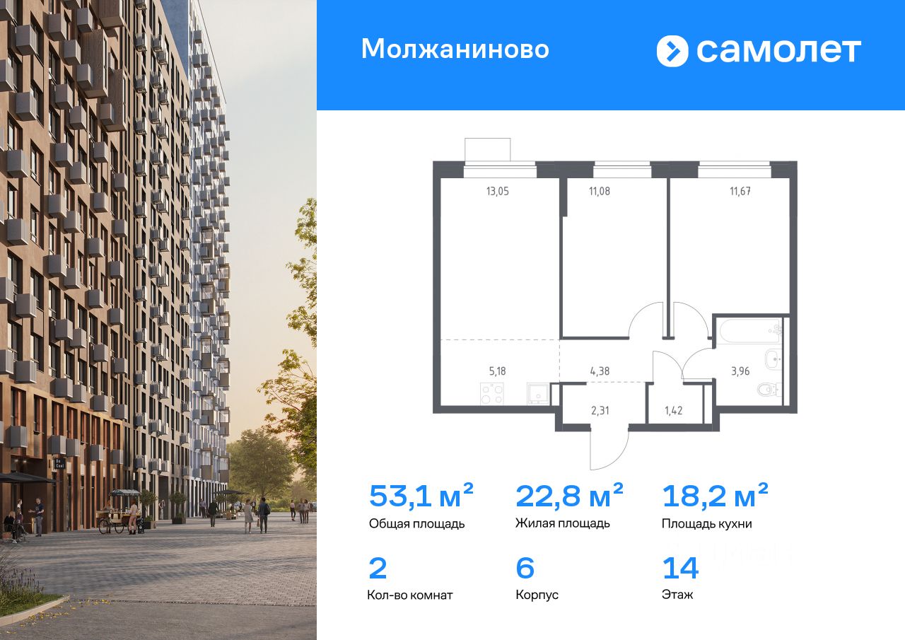 Предлагается 2-комнатная квартира комфорт-класса 53,05 кв.м в корпусе 6 на 14 этаже, в ЖК "Молжаниново"