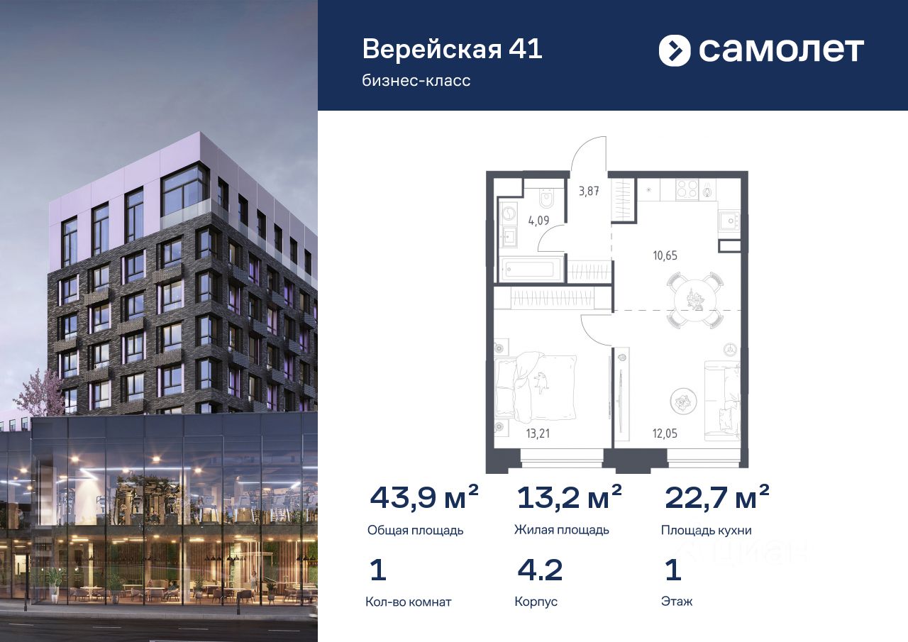 Предлагается 1-комнатная квартира бизнес-класса 43,87 кв.м в корпусе 4.2 на 1 этаже, в "Верейская 41"