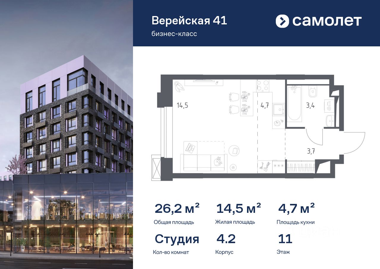 Предлагается квартира студия бизнес-класса 26,23 кв.м в корпусе 4.2 на 11 этаже, в "Верейская 41"