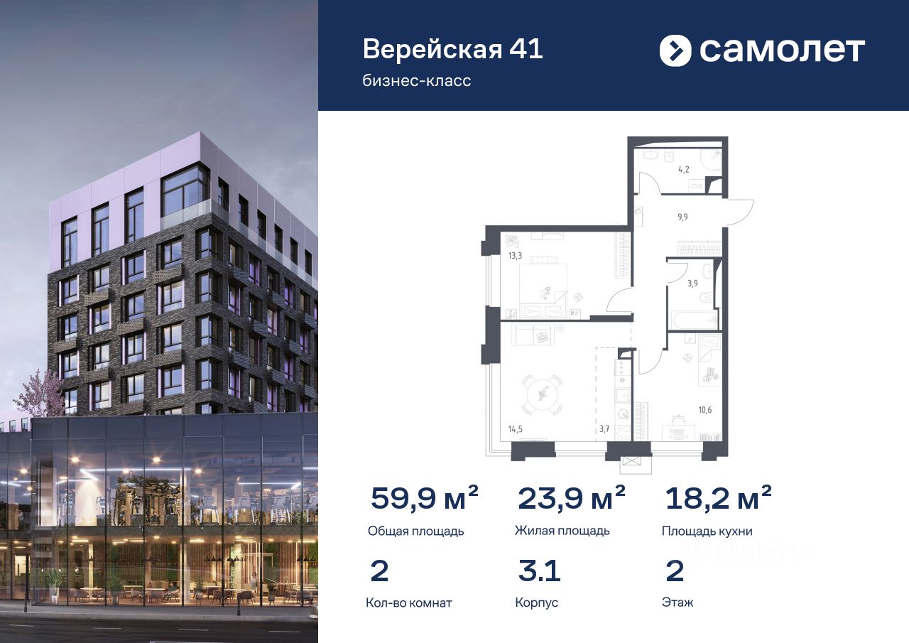 Предлагается 2-комнатная квартира бизнес-класса 59,88 кв.м в корпусе 3.1 на 2 этаже, в "Верейская 41"