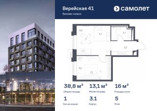 Предлагается 1-комнатная квартира бизнес-класса 38,76 кв.м в корпусе 3.1 на 5 этаже, в "Верейская 41"