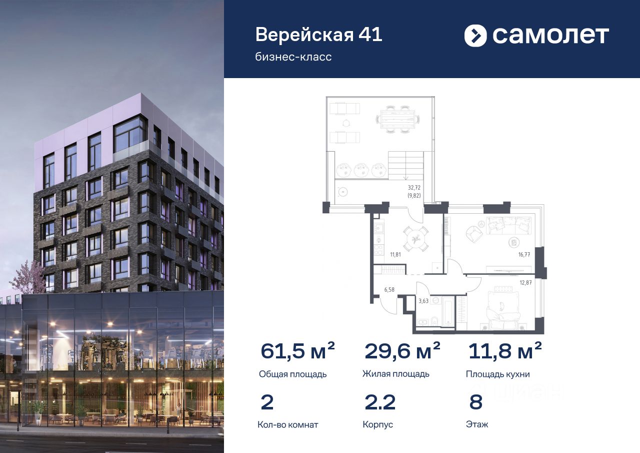 Предлагается 2-комнатная квартира бизнес-класса 61,48 кв.м в корпусе 2.2 на 8 этаже, в "Верейская 41"