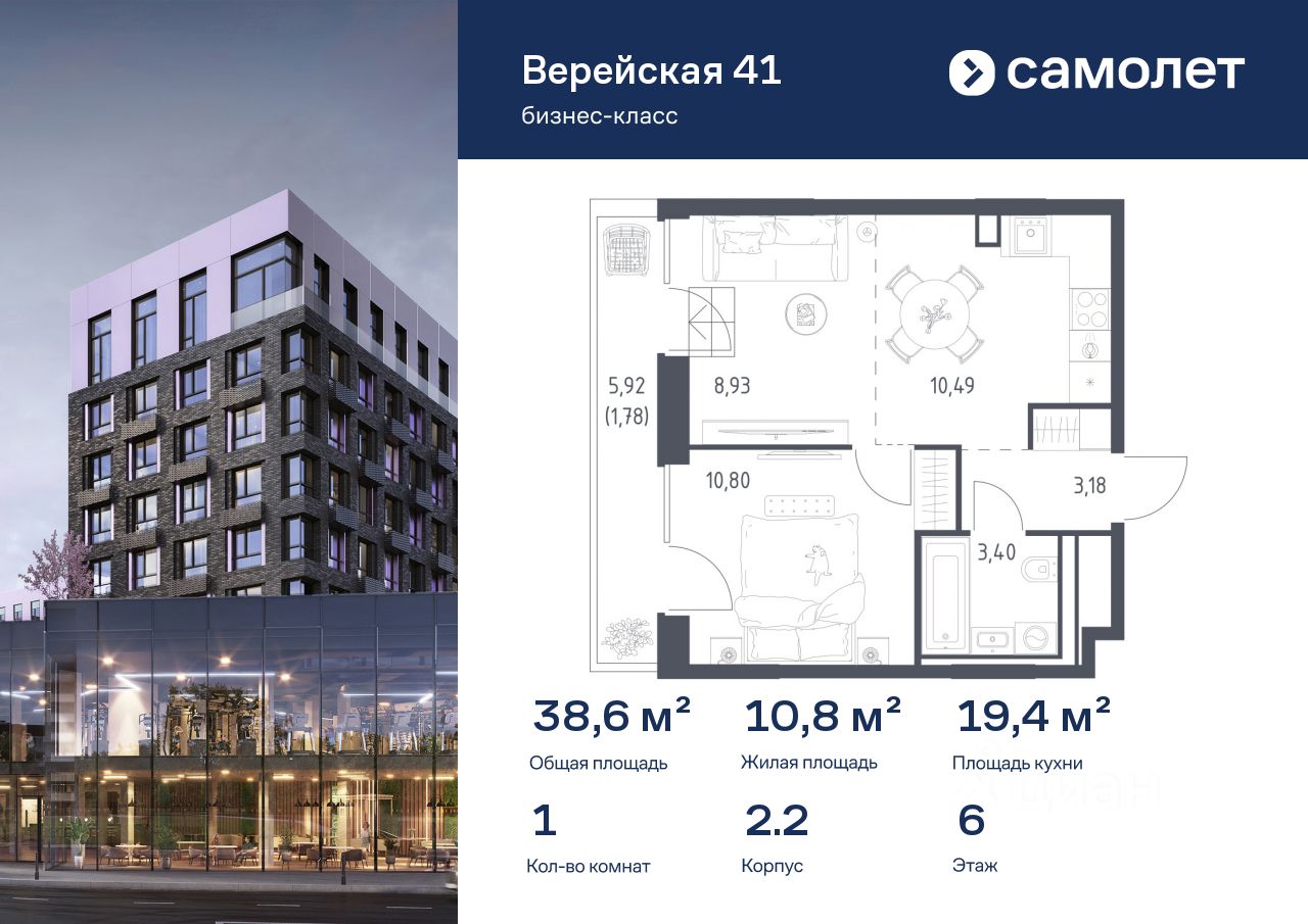 Предлагается 1-комнатная квартира бизнес-класса 38,58 кв.м в корпусе 2.2 на 6 этаже, в "Верейская 41"