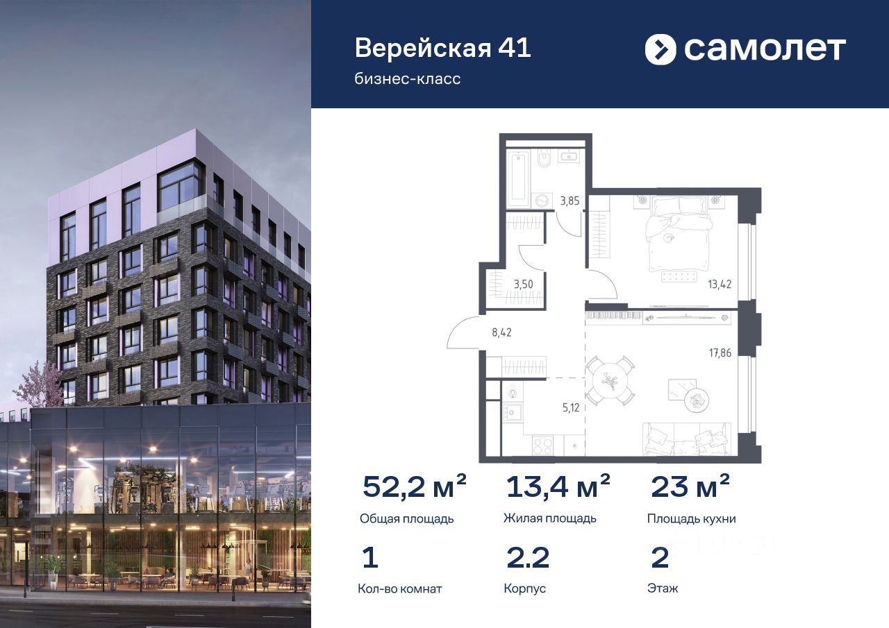 Предлагается 1-комнатная квартира бизнес-класса 52,17 кв.м в корпусе 2.2 на 2 этаже, в "Верейская 41"