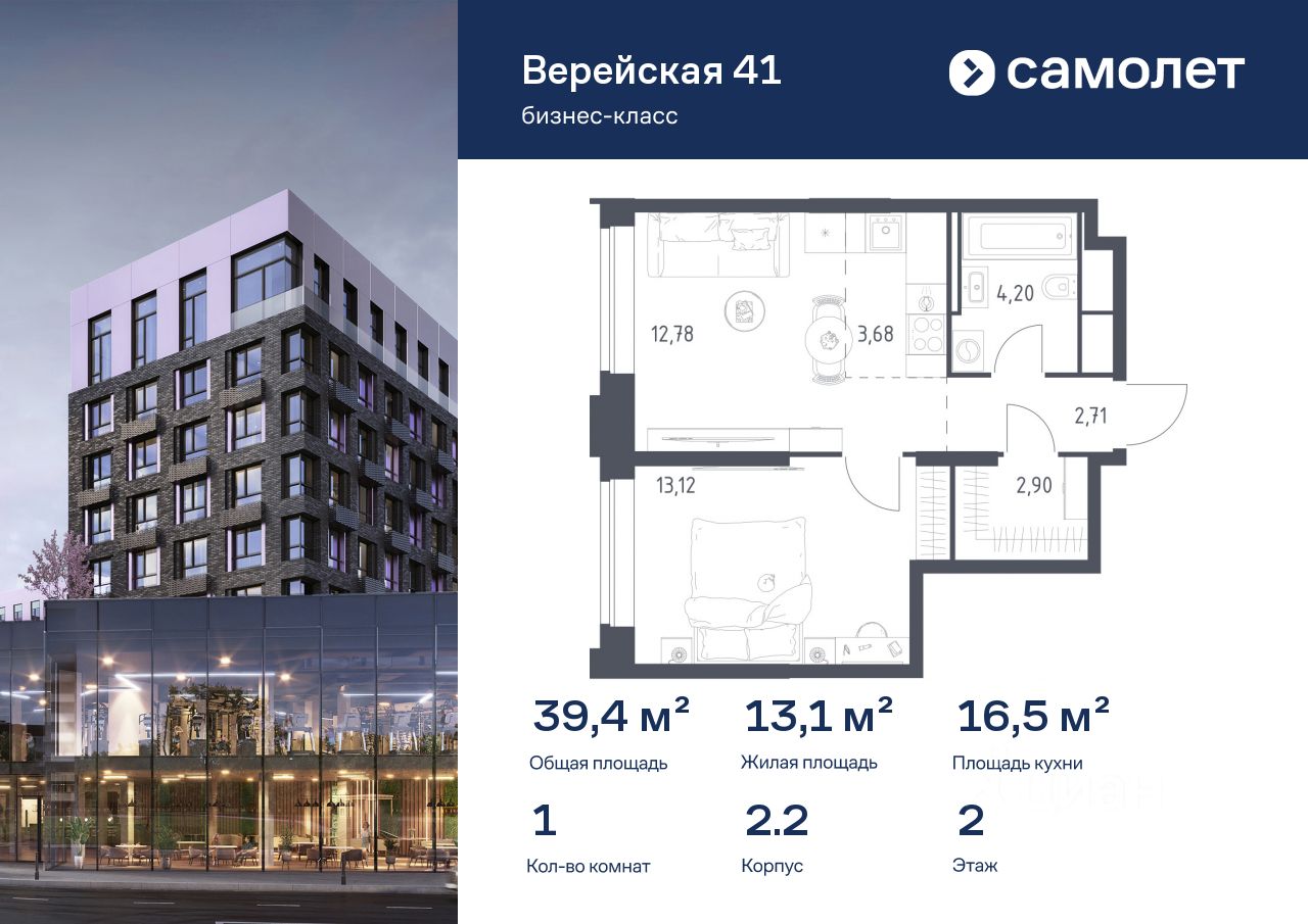 Предлагается 1-комнатная квартира бизнес-класса 39,39 кв.м в корпусе 2.2 на 2 этаже, в "Верейская 41"