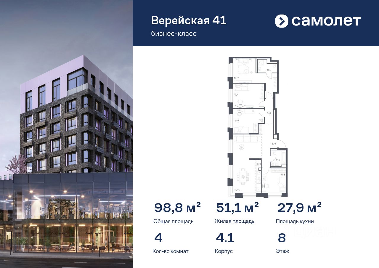 Предлагается 4-комнатная квартира бизнес-класса 98,82 кв.м в корпусе 4.1 на 8 этаже, в "Верейская 41"