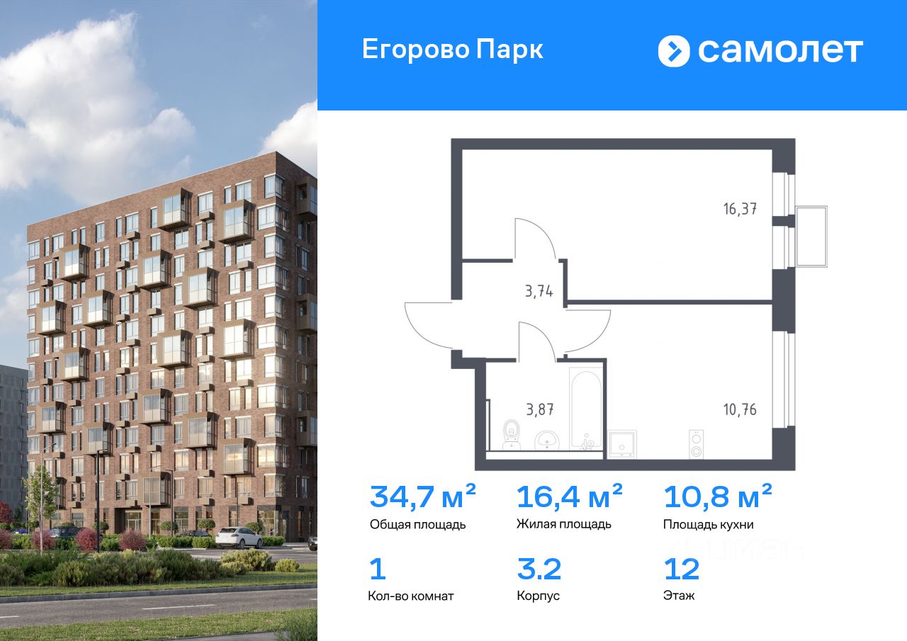 Строим кварталы для жизни с заботой о будущем. Предлагается 1-комнатная квартира комфорт-класса 34,74 кв.м в корпусе 3.2 на 12 этаже, в ЖК "Егорово Парк"