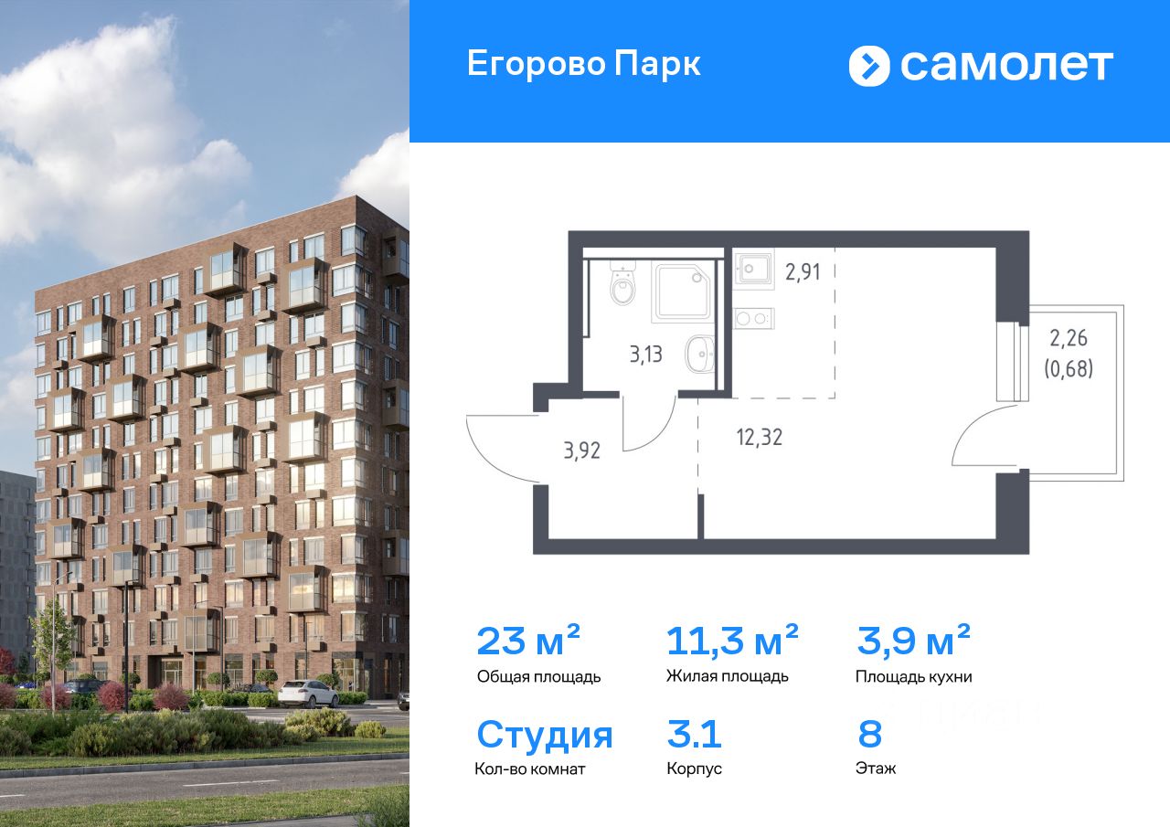 Строим кварталы для жизни с заботой о будущем. Предлагается квартира студия комфорт-класса 22,96 кв.м в корпусе 3.1 на 8 этаже, в ЖК "Егорово Парк"