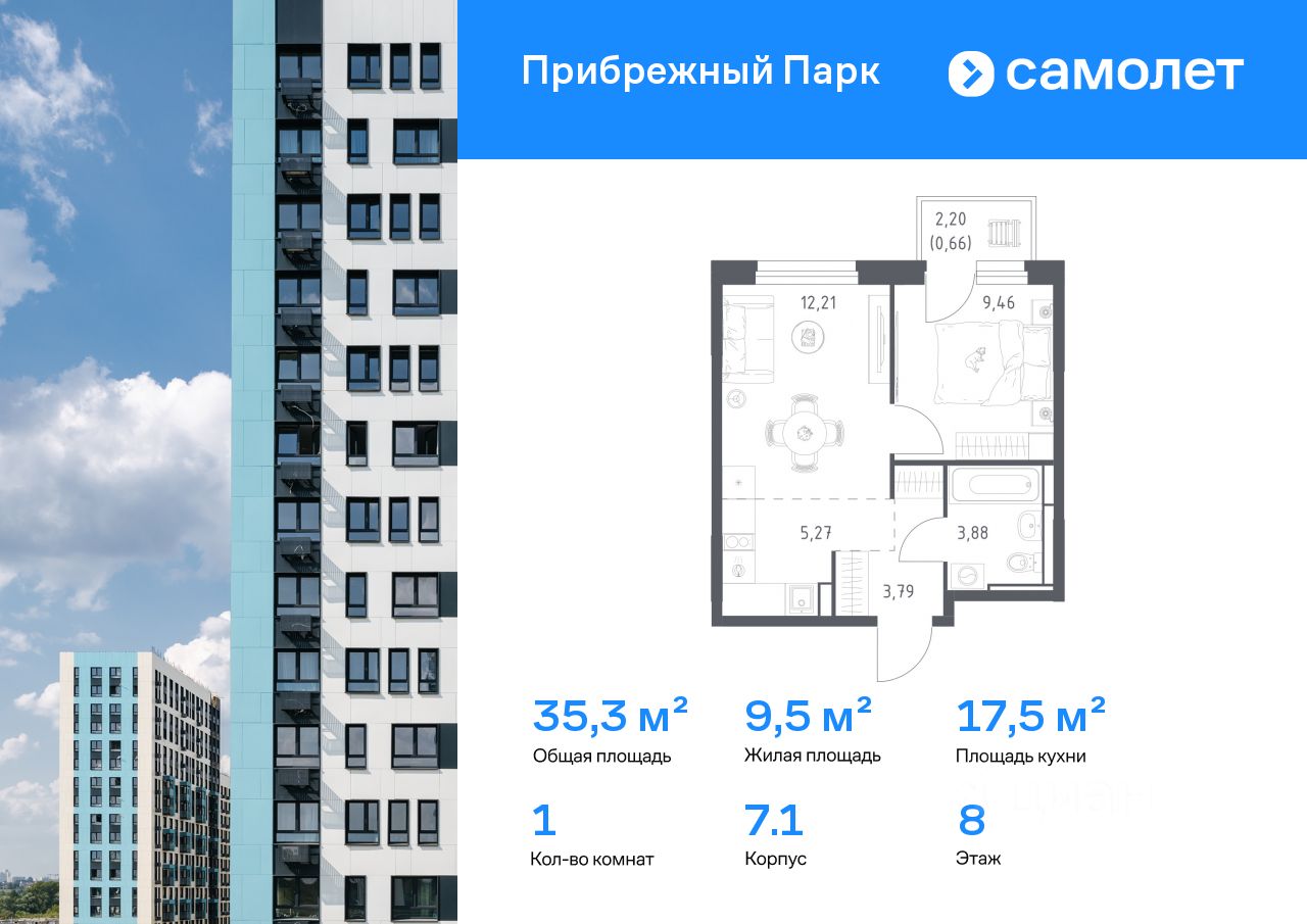 Предлагается 1-комнатная квартира комфорт-класса 35,27 кв.м в корпусе 7.1 на 8 этаже, в ЖК "Прибрежный Парк"