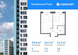 Строим кварталы для жизни с заботой о будущем. Предлагается 1-комнатная квартира комфорт-класса 34,56 кв.м в корпусе 7.1 на 13 этаже, в ЖК "Прибрежный Парк"