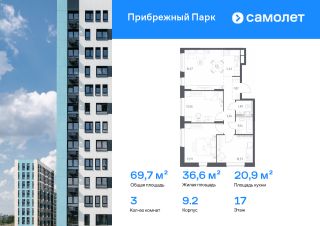 Строим кварталы для жизни с заботой о будущем. Предлагается 3-комнатная квартира комфорт-класса 69,7 кв.м в корпусе 9.2 на 17 этаже, в ЖК "Прибрежный Парк"