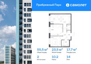Предлагается 2-комнатная квартира комфорт-класса 55,53 кв.м в корпусе 10.2 на 14 этаже, в ЖК "Прибрежный Парк"