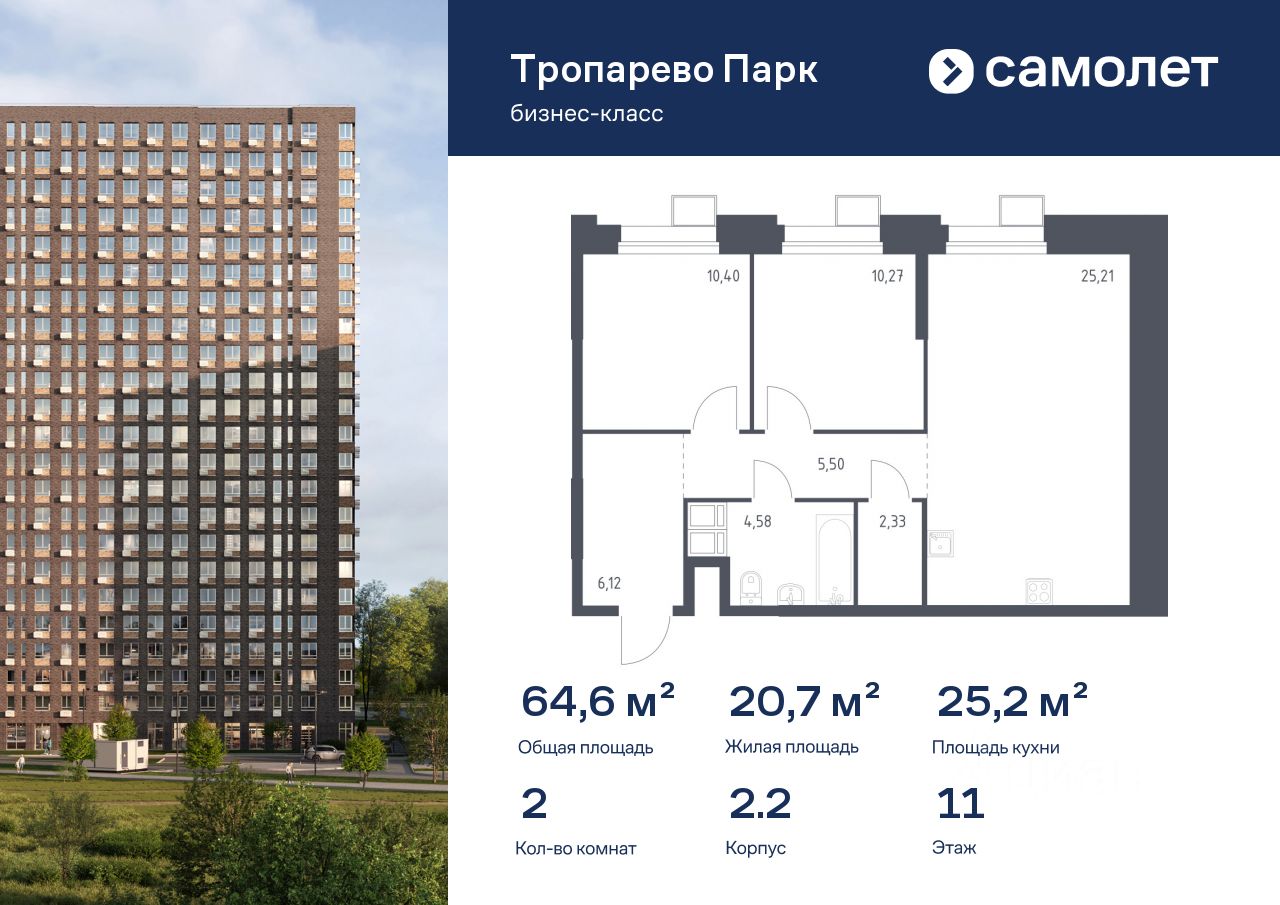 Предлагаются 2-комнатные апартаменты бизнес-класса 64,58 кв.м в корпусе 2.2 на 11 этаже, в МФК "Тропарево Парк"
