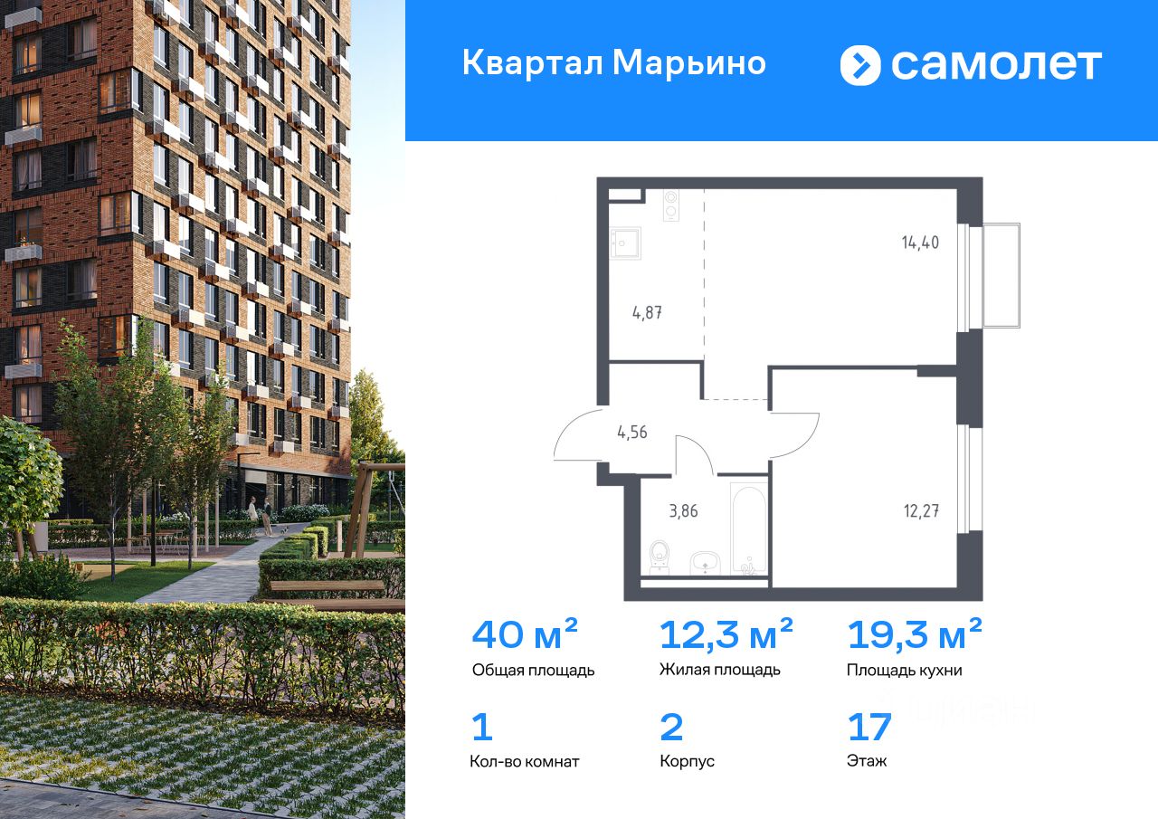 Предлагается 1-комнатная квартира комфорт-класса 39,96 кв.м в корпусе 2 на 17 этаже, в ЖК "Квартал Марьино"