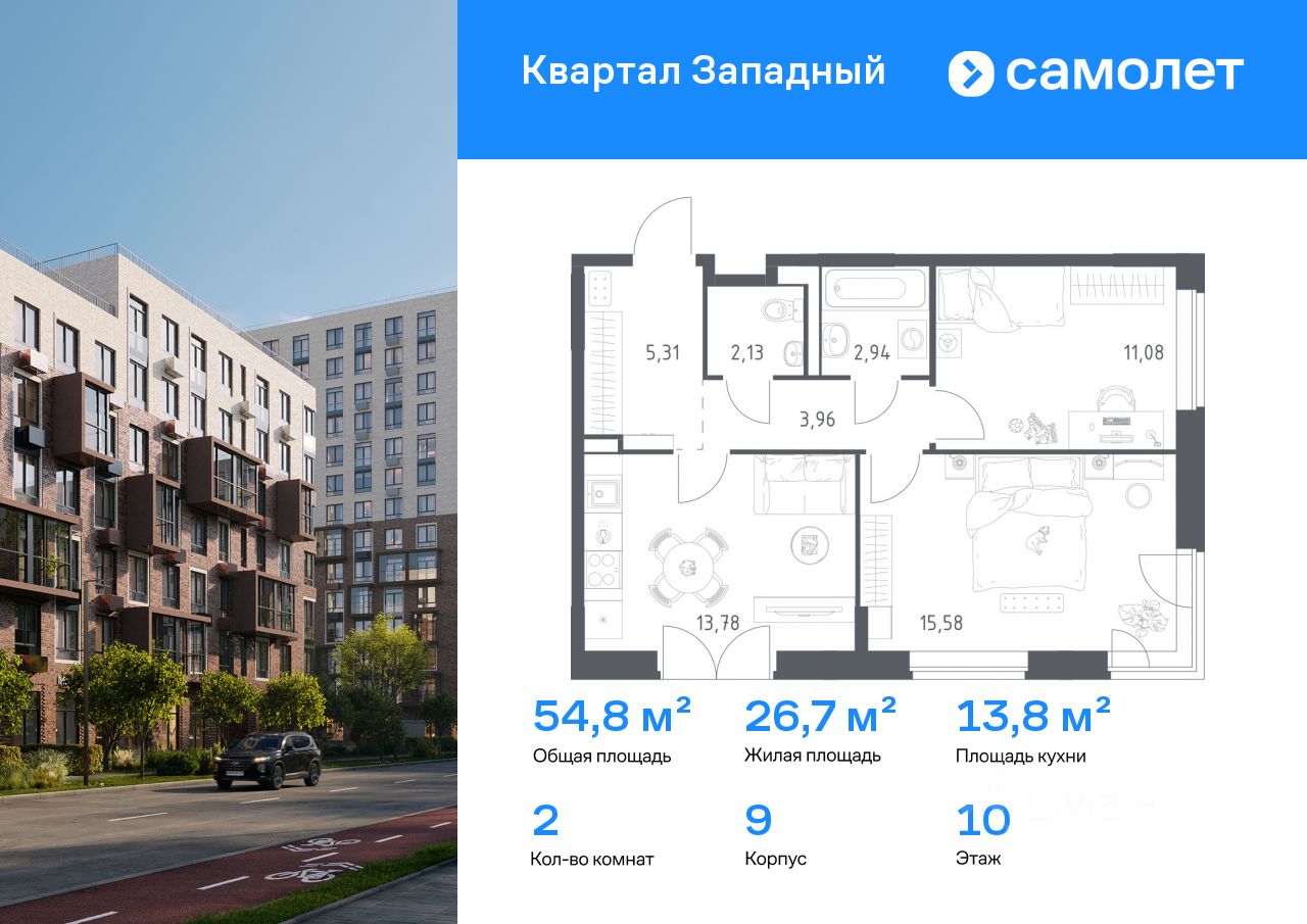 Предлагается 2-комнатная квартира комфорт-класса 54,78 кв.м в корпусе 9 на 10 этаже, в ЖК "Квартал Западный"