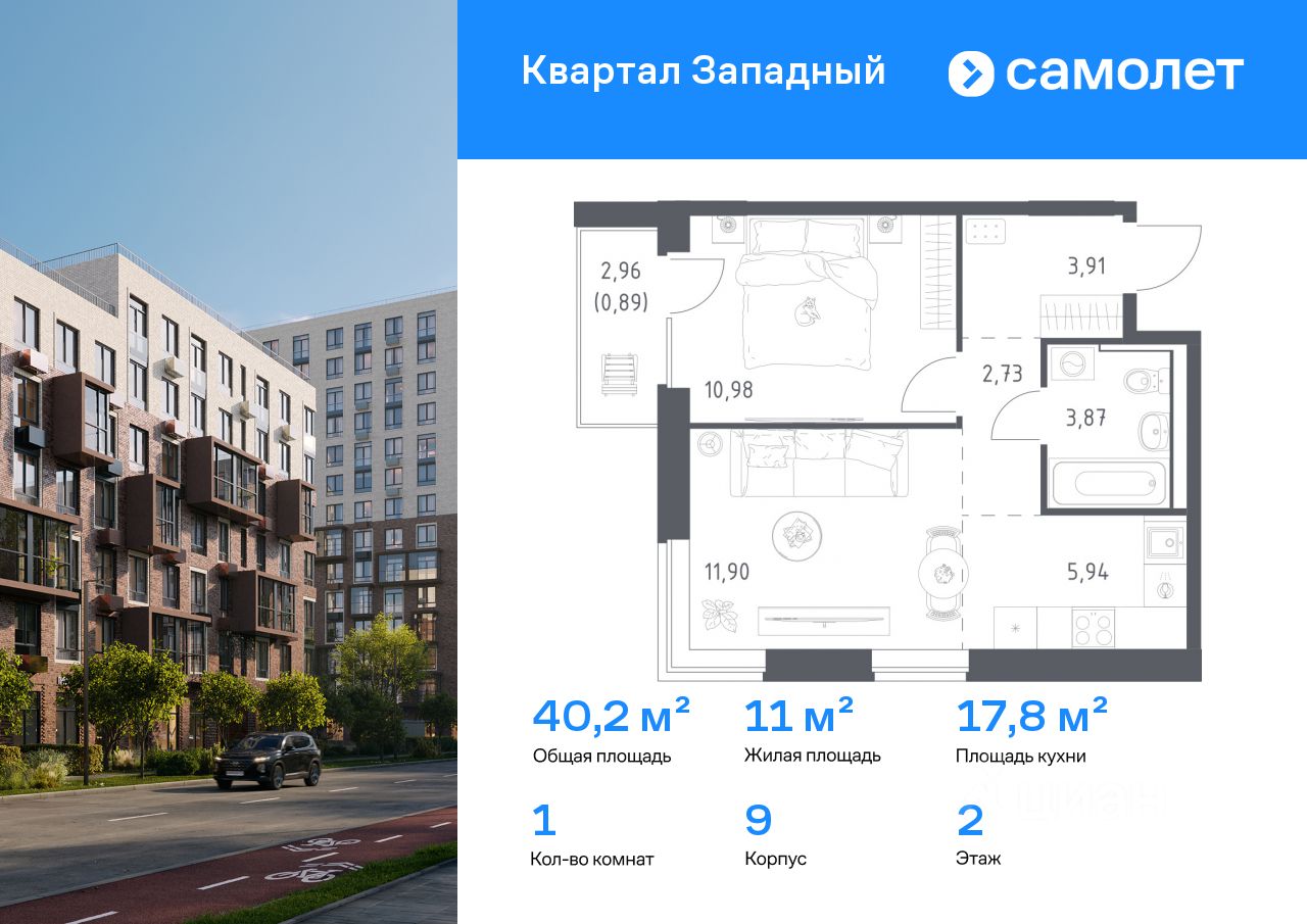 Предлагается 1-комнатная квартира комфорт-класса 40,22 кв.м в корпусе 9 на 2 этаже, в ЖК "Квартал Западный"