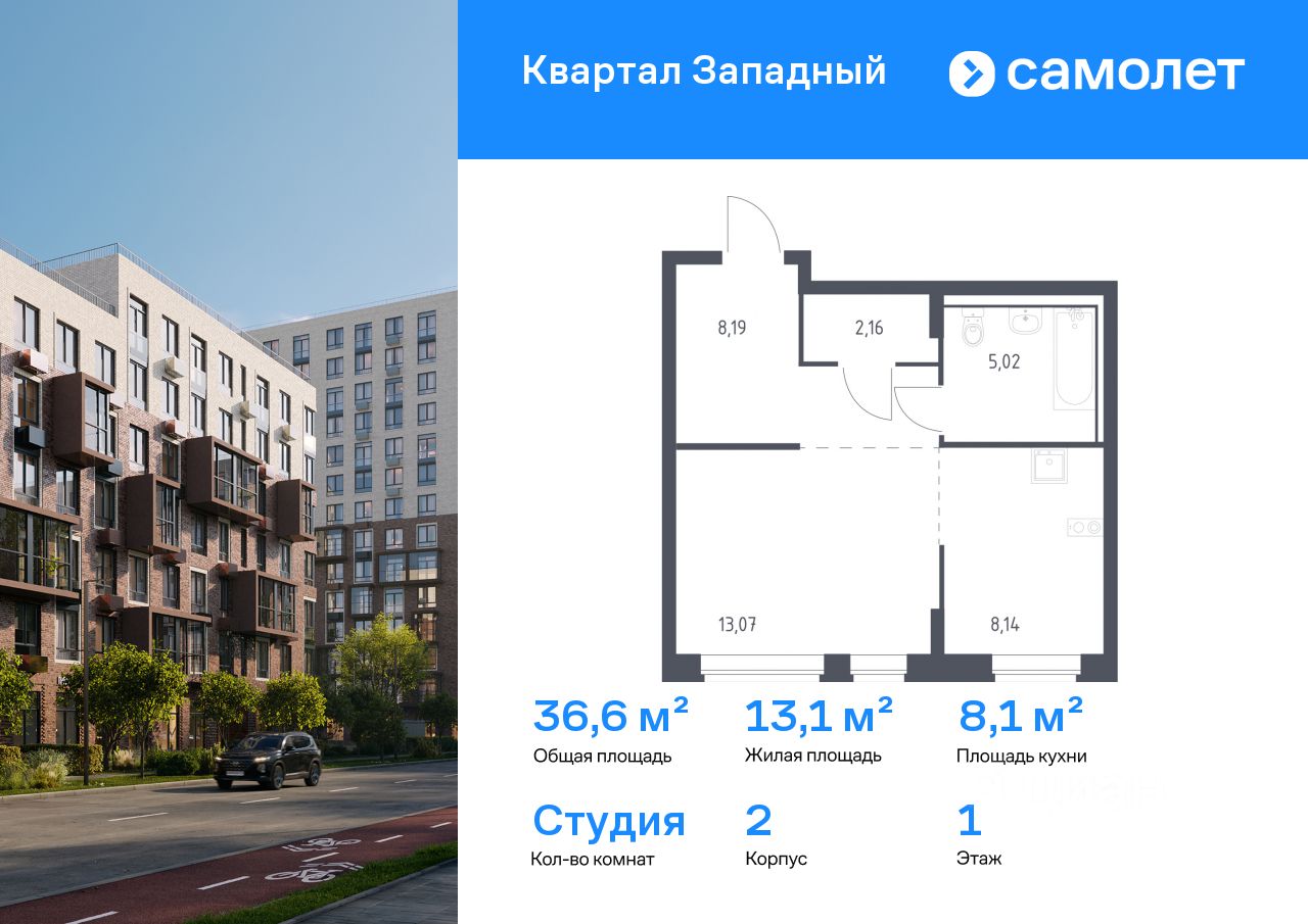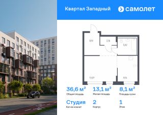 Предлагается квартира студия комфорт-класса 36,58 кв.м в корпусе 2 на 1 этаже, в ЖК "Квартал Западный"