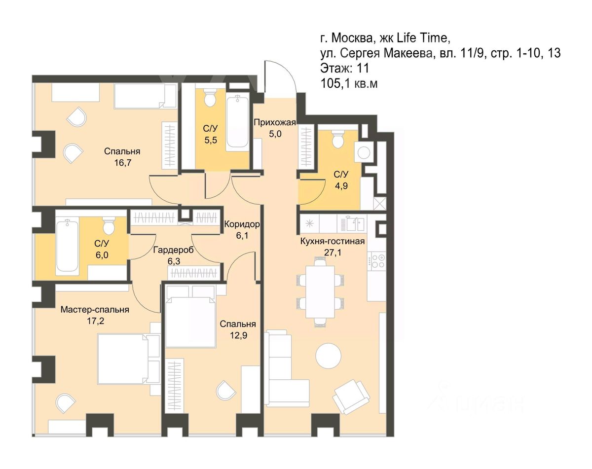 Предлагается на продажу 4-х комнатная квартира площадью 105.1 кв.м в ЖК премиум класса Life Time.