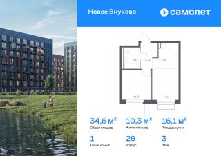 Предлагается 1-комнатная квартира комфорт-класса 34,63 кв.м в корпусе 29 на 3 этаже, в ЖК "Новое Внуково"