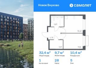 Предлагается 1-комнатная квартира комфорт-класса 32,35 кв.м в корпусе 28 на 5 этаже, в ЖК "Новое Внуково"