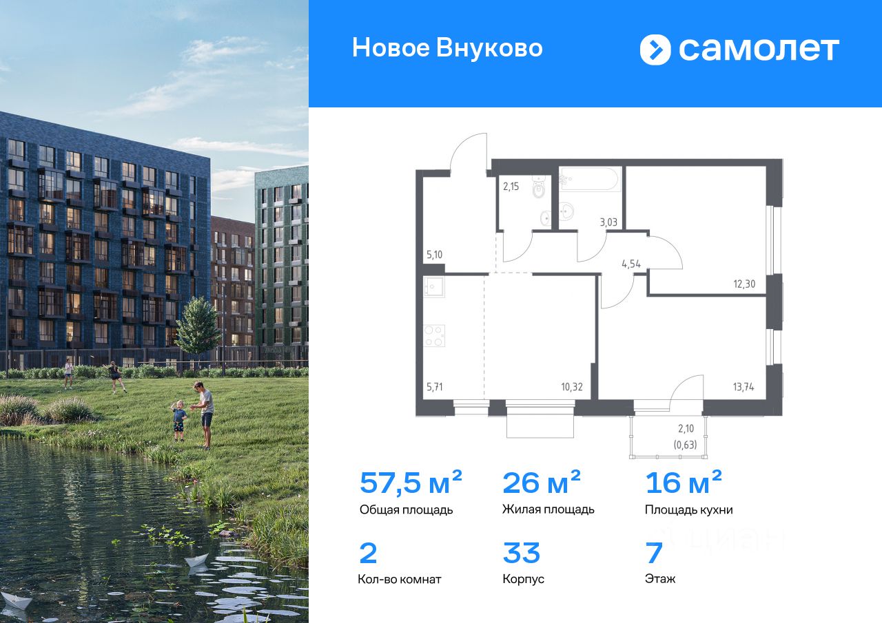 Предлагается 2-комнатная квартира комфорт-класса 57,52 кв.м в корпусе 33 на 7 этаже, в ЖК "Новое Внуково"