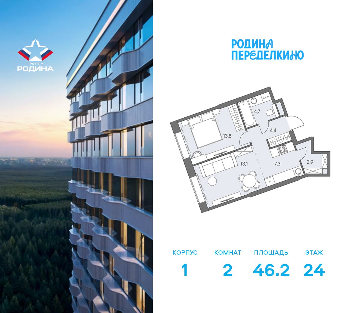Продаётся 2-комнатная квартира площадью 46.2 м² на 24 этаже в Жилом Комплексе "Родина Переделкино".