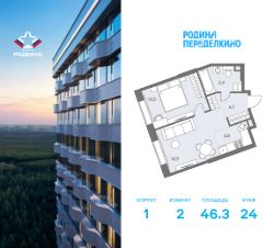 Продаётся 2-комнатная квартира площадью 46.3 м² на 24 этаже в Жилом Комплексе "Родина Переделкино".