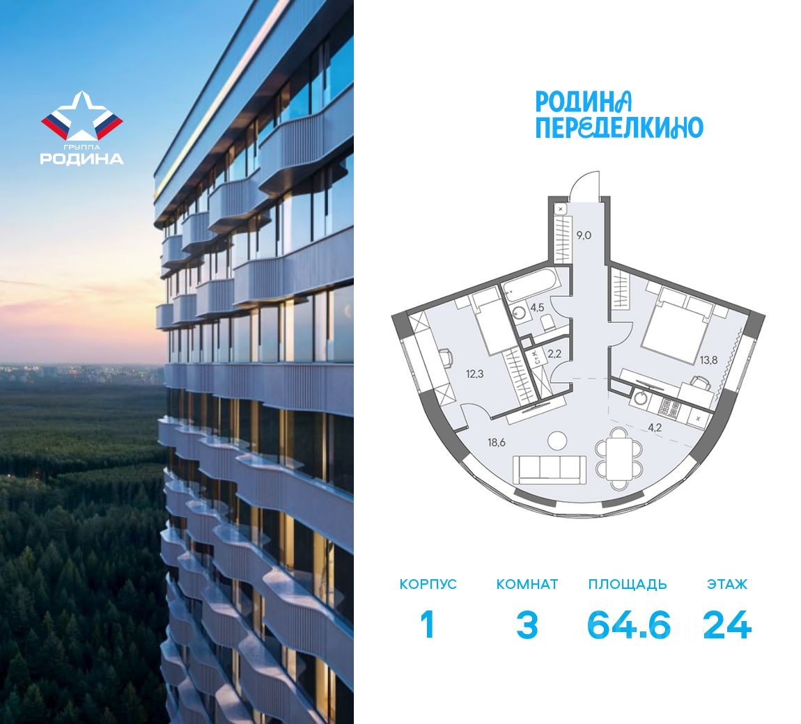 Продаётся 3-комнатная квартира площадью 64.6 м² на 24 этаже в Жилом Комплексе "Родина Переделкино".