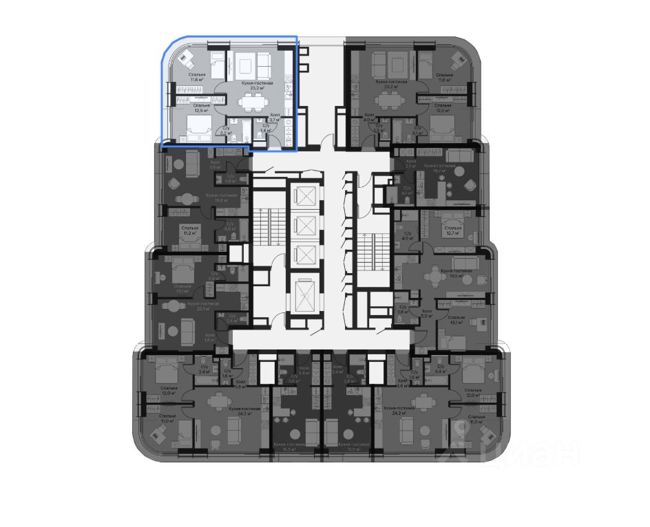 Две изолированные комнаты 11,6 кв м и 12,5 кв м. Одна комната с панорамным круговым остеклением, вторая с изолированным санузлом.