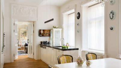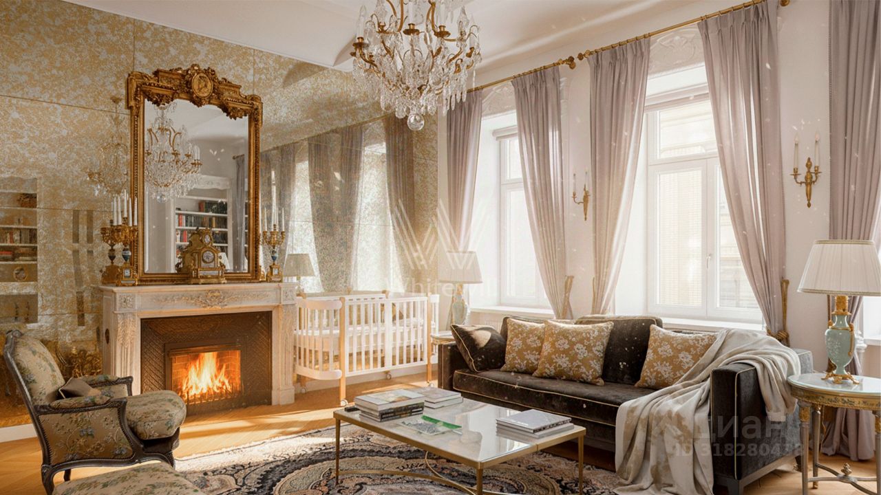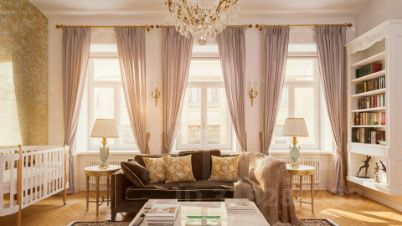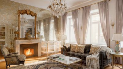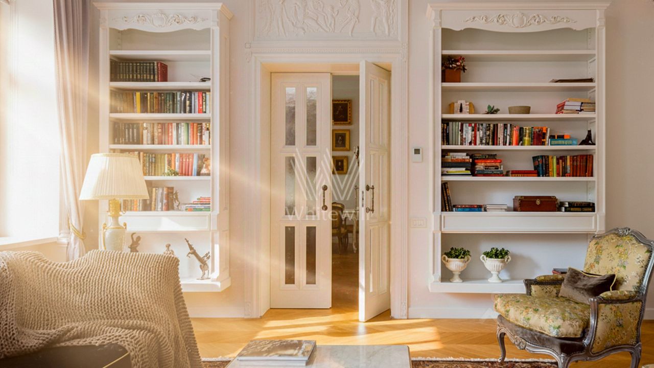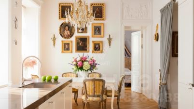 Светлый интерьер украшен лепниной и предметами искусства и антиквариата, на полу уложен паркет из натурального дерева.