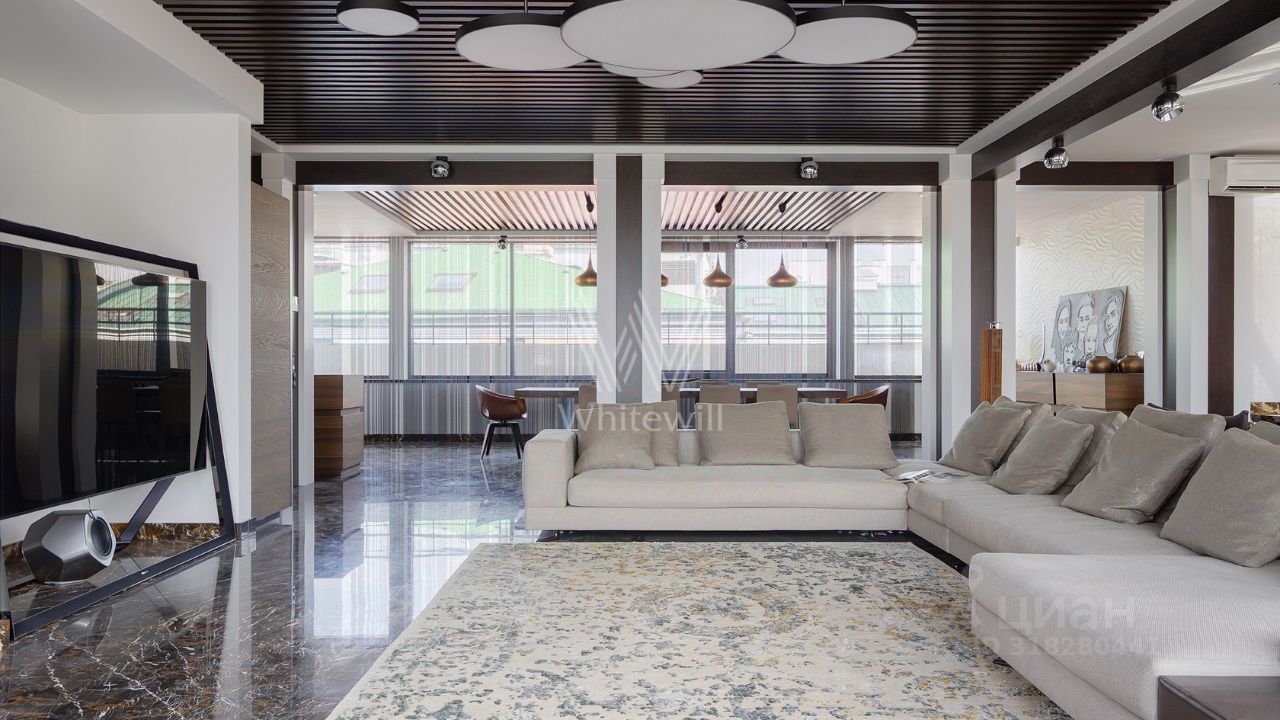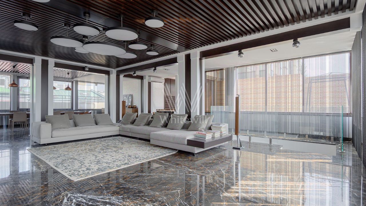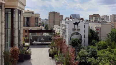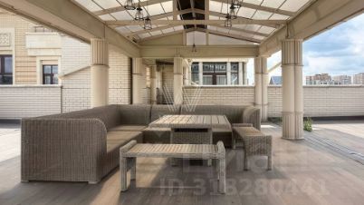 Верхний этаж пентхауса остеклён с трёх сторон, пространство наполнено естественным светом. В гостиной обустроена зона отдыха с бездымным биокамином и креслами Cloudspace Diesel by Moroso. На уютной круговой террасе обустроено пространство для отдыха, зона барбекю, открываются живописные виды на городской пейзаж Арбата. Доступно три машиноместа в подземном паркинге.